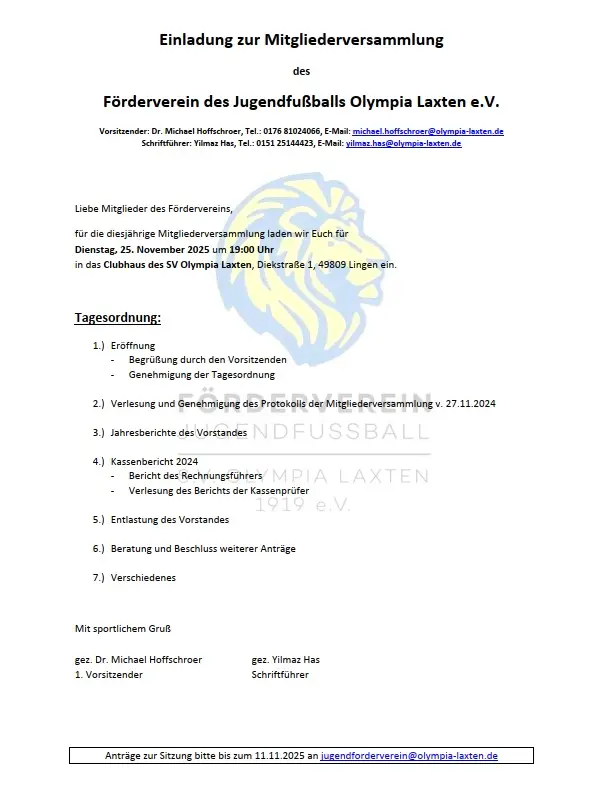 Am Di 25.11.2025 um 19:00 Uhr findet die Mitgliederversammlung des Förderverein des Jugendfußballs Olympia Laxten e.V. im Clubhaus statt.